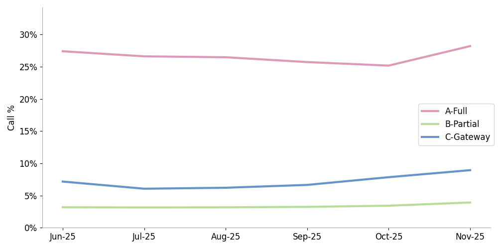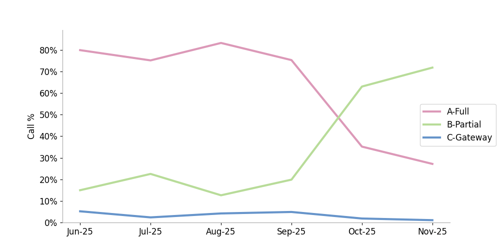 Figure 5 shows the percentage of calls signed by attestation level. Calls signed with full A-level attestation were 28.2% in November, up 3.0% from October. Calls signed with B-level attestation were 3.9%, up 0.5% from October. Calls signed with C-level attestation were 8.9%, up 1.0% from October.