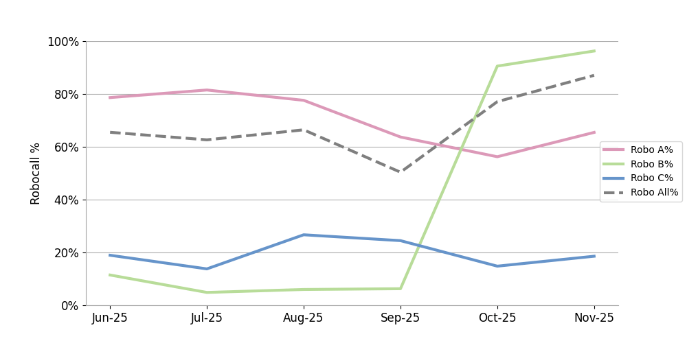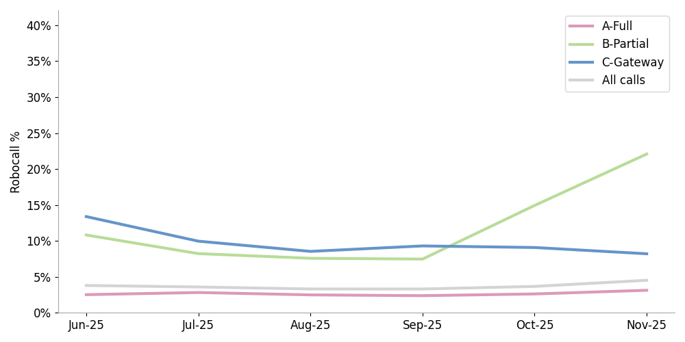 In November, the robocall percentage among prolific robocall signers was up 10.0% across all attestation levels. Robocalls with A-level attestation were up 9.2%. Robocalls with B-level attestation were up 5.7%. Robocalls with C-level attestation were up 3.8%.