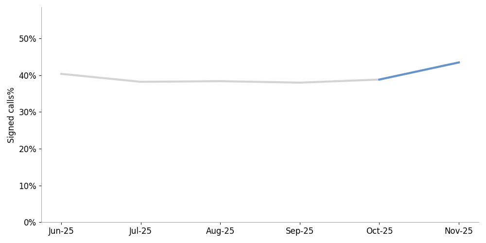 Figure 4 shows the percentage of signed calls at termination for the past six months. This was up 4.7% in November, to 43.5%.