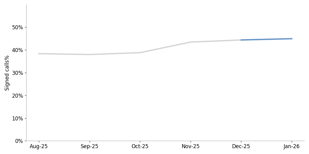 Figure 4 shows the percentage of signed calls at termination for the past six months. This was up 0.5% in January, to 44.9%.